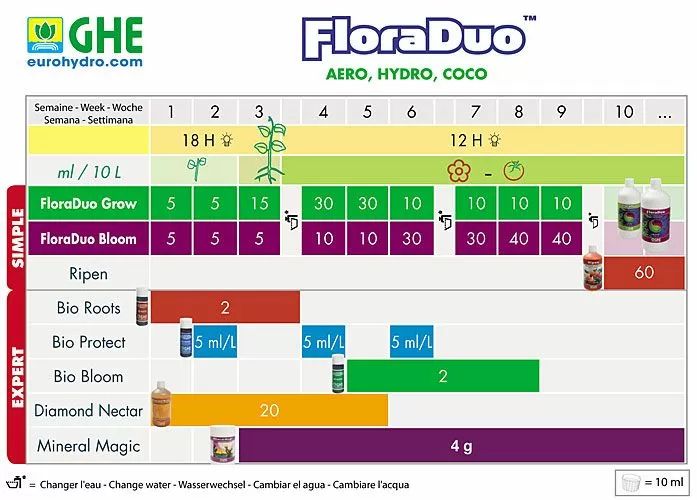 GHE DualPart Bloom 1l. ( FloraDuo in the past) part of the highly concentrated two-component fertilizer GHE DualPart for growing in soil, hydroponics or in coco substrate. Just two bottles - Grow and Bloom are all your plants need from the beginning to the end of the harvest . With DualPart you start with equal amounts of Grow and Bloom during rooting or early development, in vegetative growth - more Grow than Bloom, and in flowering and fruiting - more Bloom than Grow. It's that simple!