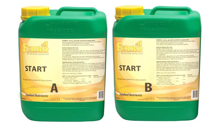 Ferro START A&B is a complete two-component fertilizer for the initial feeding of young plants grown in soil or hydroponically . This high-quality product is also ideal for watering cuttings .