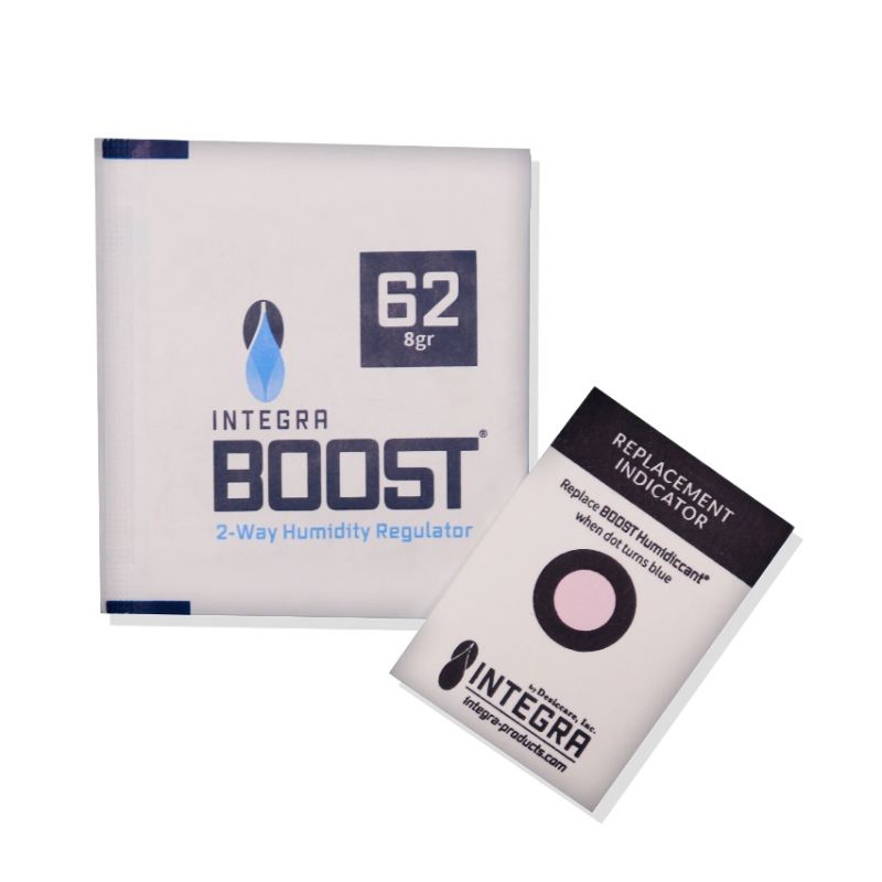 Integra Boost 2-Way Humidity Controller 62% . Our patented technology will release or absorb moisture, maintaining a relative humidity of 62% in your container with herbs , spices or food . Integra Boost packaging also includes a replacement indicator card to help you determine if your controller needs to be replaced. When the dot on the indicator card turns bright blue , you can replace your Integra Boost® package with a new one.