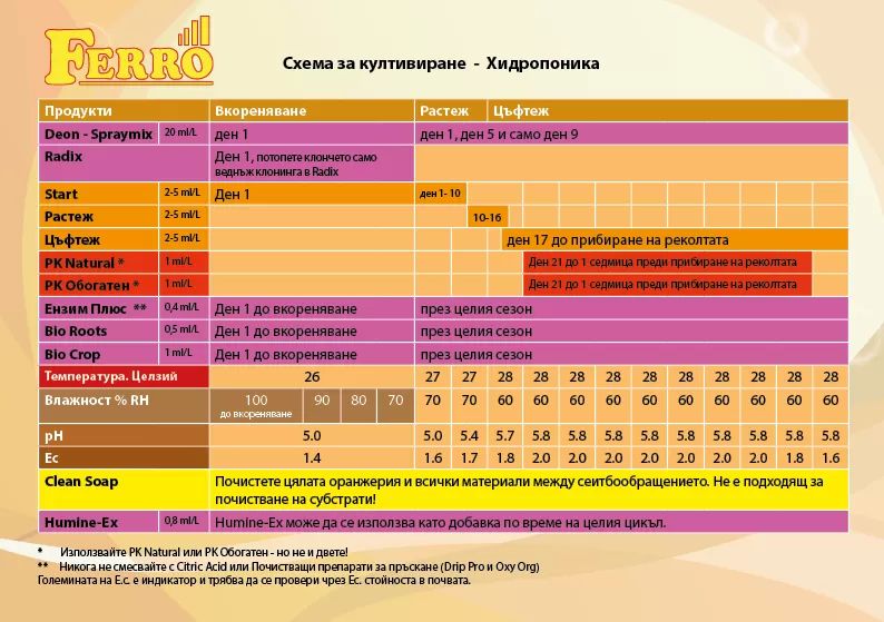 • Препоръчително е да се работи със стойности на ЕС 1.5 - 2.2 и на рН 5.4 - 6.0.