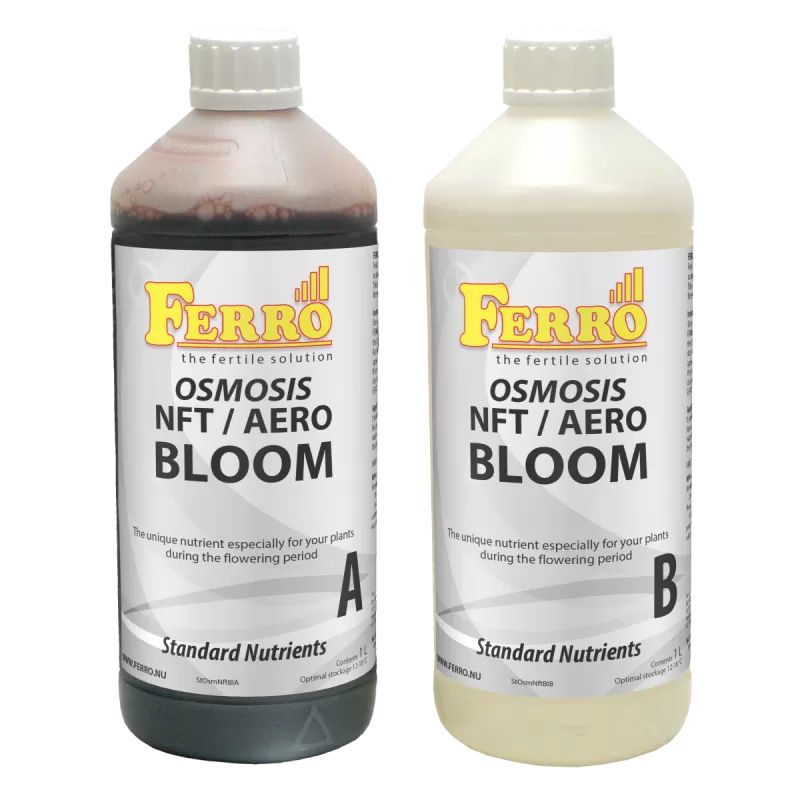 Ferro OSMOSIS NFT / AERO BLOOM A&B е пълноценен двукомпонентен тор за фазата на цъфтеж на растения, които се отглеждат в NFT / AERO (известни също като рециркулационни системи), така наречените мехурчести (bubbleponics) системи или DWC (deep water culture) системи. При отглеждане с NFT / AERO системи е изключително важно да се поддържа рН в средата (вода / въздух) на стабилно ниво между оптималните стойности от 5.0 и 6.0. Генерирането на мехурчета (чрез използване на аератори в хранителния разтвор) и впръскването на хранителни разтвори в тръби или по други начини също могат да се считат за NFT / AERO системи. За перфектни резултатиизползвайте този висококачестен продукт с всяко поливане, през цялата фаза на цъфтеж! Предназначен за употреба с осмозна вода (пречистена чрез обратна осмоза).