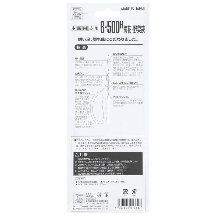 Chikamasa B-500H е висококачествен професионален инструмент от Япония, предназначен за фини операции като оформяне на бонсай, селекция и подрязване на цветя. Има прави остриета от висококачествена въглеродна стомана, обработени със закръглени външни ръбове, които предпазват деликатните повърхности на стъбла и цветове от нараняване.